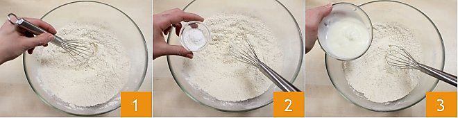 Um die Dinkelmuffins mit Erdbeeren und Mandeln zuzubereiten, mischen Sie in einer Schüssel das Dinkelmehl und den Rohrohrzucker mit einem Schneebesen 1. Fügen Sie dann das Backpulver 2 und den Joghurt 3 hinzu,