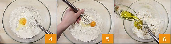 brechen Sie dann die Eier auf und fügen Sie sie hinzu 4, dann mischen Sie mit dem Schneebesen 5. Zum Schluss geben Sie das Olivenöl extra vergine in einem dünnen Strahl hinzu 6 und vermischen die Zutaten gut.