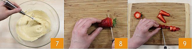 Rühren Sie weiter mit einem Spatel, bis Sie eine homogene und weiche Masse erhalten 7. Waschen Sie die Erdbeeren, entfernen Sie die Stiele und schneiden Sie sie in Stücke (8-9).