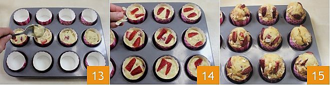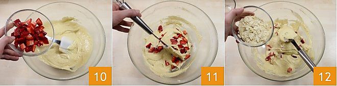 Fügen Sie die Erdbeeren dem Muffinteig hinzu 10, rühren Sie um 11 und geben Sie schließlich die Mandelblättchen hinzu 12. Denken Sie daran, eine Handvoll Erdbeeren und Mandeln für die endgültige Dekoration beiseite zu legen.