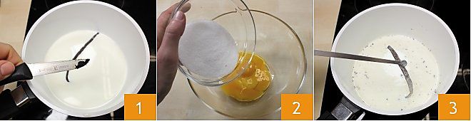 Um die Diplomatencreme ohne Gelatine zuzubereiten, beginnen Sie mit der Zubereitung der Puddingcreme: Erhitzen Sie die Milch in einem kleinen Topf mit der Hälfte einer Vanilleschote und ihren Samen 1. Schlagen Sie in einer Schüssel das Eigelb und den Zucker mit einem Schneebesen 2 und fügen Sie dann das Mehl hinzu. Entfernen Sie die Vanilleschote mit einer Zange 3