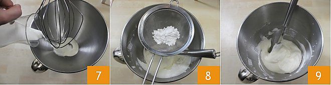 Bereiten Sie die Chantilly-Creme vor: Gießen Sie die gut gekühlte Sahne in die Schüssel einer Küchenmaschine mit Schneebesenaufsatz 7, oder verwenden Sie einen elektrischen Handmixer, und schlagen Sie die Sahne; wenn die Sahne eine feste Konsistenz erreicht hat, fügen Sie den gesiebten Puderzucker hinzu 8 und rühren Sie ihn mit einem Spatel unter die Sahne 9.