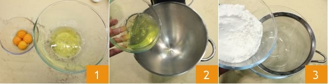 Um die dreifarbigen Baiser vorzubereiten, beginnt mit der Zubereitung der französischen Baiser. Trennt die Eigelbe von den Eiweißen und gebt sie in eine Küchenmaschine oder einen hohen Behälter 1. Gebt die Eiweiße in eine Küchenmaschine mit Schneebesen oder eine hohe Schüssel 2 und beginnt mit mittlerer Geschwindigkeit zu schlagen. Siebt inzwischen den Puderzucker in eine separate Schüssel 3.