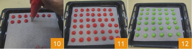 Nehmt nun ein Backblech und legt es mit Backpapier aus. Füllt die gefärbten Baisermischungen in zwei verschiedene Spritzbeutel mit glatter Tülle; beginnt mit einem und macht kleine Baiserkreise mit einem Durchmesser von 2 oder 3 cm 10, indem ihr sie voneinander absetzt. Ihr solltet 30 kleine Baiser erhalten. Wiederholt den Vorgang auch für den anderen Spritzbeutel. Backt sie im vorgeheizten statischen Ofen bei 90°C für mindestens 3 Stunden, wobei ihr darauf achtet, die Ofentür leicht offen zu lassen, um so viel Feuchtigkeit wie möglich entweichen zu lassen. Nach dem Trocknen 12 herausnehmen und abkühlen lassen.