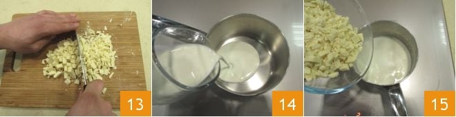 Macht inzwischen mit der Zubereitung der weißen Schokoladencreme weiter. Hackt die weiße Schokolade auf einem Schneidebrett 13. Dann gebt die Sahne in einen kleinen Topf und bringt sie zum Kochen 14. Wenn sie den Siedepunkt erreicht, nehmt den Topf vom Herd und fügt die gehackte Schokolade hinzu 15, während ihr mit einem Spatel weiter rührt, um die Schokolade zu schmelzen und Klumpenbildung zu vermeiden. Dann überträgt die Creme in eine kleine Schüssel. Deckt sie mit Frischhaltefolie direkt auf der Oberfläche ab, um die Bildung einer Haut zu verhindern, und lasst sie bei Raumtemperatur abkühlen. Sobald sie Raumtemperatur erreicht hat, stellt eure Creme für mindestens 1 Stunde in den Kühlschrank.