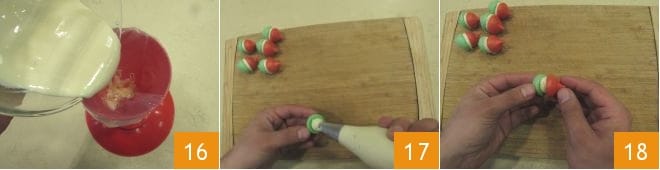 Dann füllt die weiße Schokoladencreme in einen Spritzbeutel 16. Nehmt ein grünes Baiser und füllt es auf der flachen Seite mit der Creme 17, dann legt ein rotes Baiser darauf 18. Wiederholt den Vorgang für die 30 Baiser und genießt sie für einen köstlichen Befreiungstag!
