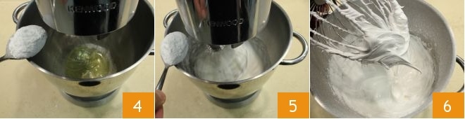 Fügt 110 g Puderzucker nach und nach hinzu und schlagt weiter mit den Schneebesen 4. Wenn die Eiweiße steif geschlagen sind, fügt den restlichen Puderzucker löffelweise hinzu 5, wobei ihr sicherstellt, dass ihr einen Löffel erst hinzufügt, wenn der vorherige vollständig eingearbeitet ist, bis ihr ein weißes und schaumiges Baiser erhaltet 6.