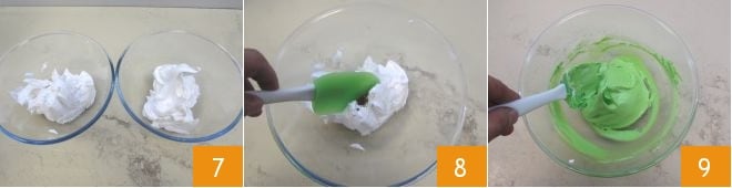 Teilt dann den erhaltenen Teig gleichmäßig auf zwei verschiedene Schälchen auf 7. Gebt einen 1 g grünen Farbstoff in eine der Schälchen 8: Rührt gut mit einem Spatel, um die Farbe gleichmäßig zu verteilen 9. Wiederholt den Vorgang mit dem roten Farbstoff.