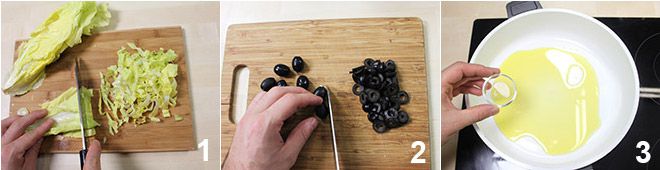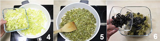 Um die Endivienküchlein zuzubereiten, putzen, waschen und schneiden Sie den Endiviensalat in feine Streifen 1, dann schneiden Sie die schwarzen Oliven in dünne Ringe 2. In einer beschichteten Pfanne erhitzen Sie bei schwacher Hitze 2 Knoblauchzehen mit etwas Öl 3 und,