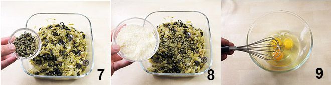 den Kapern 7 und dem Parmigiano Reggiano 8. Mischen Sie alle Zutaten gut und beginnen Sie den Teig vorzubereiten: Schlagen Sie die Eier 9