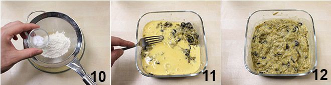 zusammen mit Natron und dem gesiebten Mehl 10, dann fügen Sie die Mischung den Endivien hinzu und mischen Sie gut (11-12).