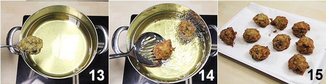 Erhitzen Sie in einer Pfanne das Pflanzenöl und, wenn es die Temperatur von 180° erreicht hat, beginnen Sie zu frittieren 13. Wenn Sie kein Küchenthermometer haben, um die Temperatur des Öls zu überprüfen, nehmen Sie einen Teelöffel Teig und tauchen ihn ins Öl: Wenn er an der Oberfläche bleibt und beginnt zu brutzeln, ist die Temperatur korrekt. Mit einem Löffel formen Sie kleine Teigbälle, die Sie ins Öl tauchen und maximal zwei Minuten kochen lassen. Entnehmen Sie die Endivienküchlein mit einem Schaumlöffel 14 und legen Sie sie auf ein mit Küchenpapier ausgelegtes Tablett, damit sie das überschüssige Öl verlieren, dann lassen Sie sie abkühlen und servieren Sie sie.