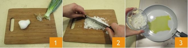 Um die Erbsen- und Ricottakroketten zuzubereiten, beginnen Sie damit, die Frühlingszwiebel zu putzen 1 und fein zu hacken 2. Dann geben Sie sie in eine Pfanne zusammen mit dem Olivenöl extra vergine und lassen Sie sie bei niedriger Flamme fünf Minuten lang anschwitzen 3.