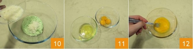 Geben Sie die Creme in eine Schüssel und fügen Sie den geriebenen Grana Padano DOP hinzu 10. In der Zwischenzeit die Eier aufschlagen und die Eigelbe von den Eiweißen in zwei verschiedene Schalen trennen (die Eiweiße werden für das Panieren verwendet) 11. Die Eigelbe mit einer Gabel verquirlen 12,