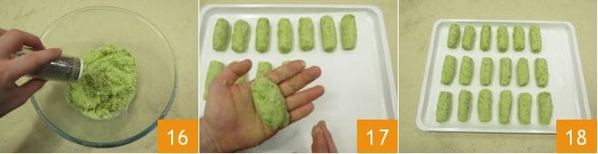 Zum Schluss mit Salz und Pfeffer abschmecken 16. 40 Gramm der Masse abnehmen und die Kroketten formen, indem Sie die Masse 17 zu Zylindern formen, die leicht abgerundet, 3 cm dick und 7 cm lang sind: So sollten Sie 18 Stück erhalten. Legen Sie die Kroketten nach und nach auf ein Tablett, auf das Sie zuvor ein Blatt Backpapier gelegt haben, damit sie nicht am Boden kleben bleiben 18.