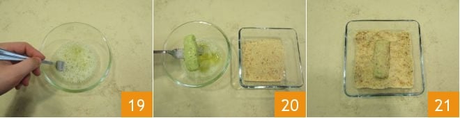 Mit einer Gabel die Eiweiße schnell für ein paar Sekunden schlagen 19 und dann eine Krokette nach der anderen eintauchen 20, gut abtropfen lassen und dann in die Semmelbrösel geben, darauf achten, dass die Krümel auf allen Seiten haften 21