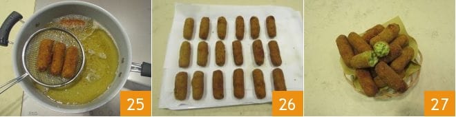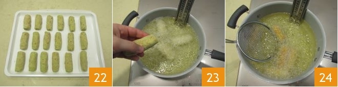 und für alle anderen Kroketten wiederholen 22. Geben Sie reichlich Pflanzenöl in eine Pfanne und erhitzen Sie es bis auf 170° (verwenden Sie ein Küchenthermometer, um die genaue Temperatur zu messen), dann geben Sie 4-5 Kroketten auf einmal hinein 23, so bleibt die Temperatur konstant, und wenden Sie sie gelegentlich, um die Garung zu vereinheitlichen 24.