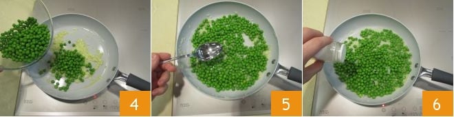 Dann die geschälten Erbsen 4 hinzufügen, auch etwas Wasser 5 und eine Prise Salz 6 dazugeben; etwa zehn Minuten weiterkochen lassen, bis das Wasser vollständig verdunstet ist.