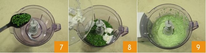 Wenn die Erbsen gar sind, lassen Sie sie abkühlen und geben Sie sie dann in einen Mixer 7, fügen Sie die Ricotta hinzu 8 und pürieren Sie, bis Sie eine kompakte Creme erhalten 9.