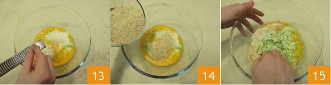 und sie zur Masse geben. Muskatnuss reiben 13, dann Semmelbrösel hinzufügen 14 und mit den Händen kneten 15.