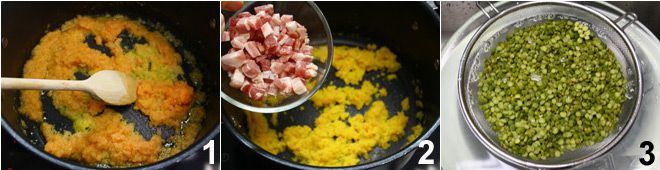 Um die Suppe aus gespaltenen Erbsen zuzubereiten, beginnen Sie damit, die gespaltenen Erbsen in reichlich kaltem Wasser einzuweichen und lassen Sie sie mindestens 3 Stunden lang stehen. Zerkleinern Sie die Karotte, den Sellerie und die Zwiebel fein und braten Sie sie mit dem Knoblauch im extra nativen Olivenöl in einem großen Topf an 1. Lassen Sie alles etwa 10 Minuten anbraten und fügen Sie dann die gewürfelte Speck hinzu 2 (wenn Sie möchten, können Sie den Speck in einer Scheibe hinzufügen) und lassen Sie ihn gut anbraten. Spülen Sie die Erbsen gut unter kaltem Wasser ab 3