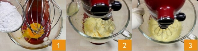 Um das Erdbeertiramisu mit Limoncello-Creme zuzubereiten, beginnen Sie mit der Mascarpone-Creme. Geben Sie die Eigelbe in eine Küchenmaschine (oder eine große Schüssel, wenn Sie einen elektrischen Mixer verwenden) und fügen Sie den Puderzucker hinzu 1; betreiben Sie dann den Mixer. Fügen Sie den Limoncello zur Eigelb-Zucker-Mischung hinzu 2 und schlagen Sie die Zutaten weiter. Fügen Sie der Mischung nach und nach den Mascarpone hinzu 3.