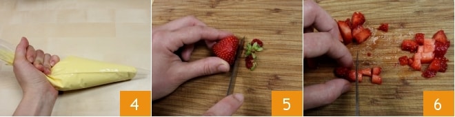 Wenn die Creme weich und schaumig ist, geben Sie sie in einen Spritzbeutel 4 und stellen Sie sie in den Kühlschrank, während Sie mit der Zubereitung fortfahren. Waschen Sie die Erdbeeren, lassen Sie 4 für die Dekoration beiseite und entfernen Sie bei den anderen die grünen Blätter 5. Schneiden Sie die Erdbeeren in kleine Stücke 6.