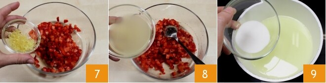 Sammeln Sie sie in einer kleinen Schüssel, geben Sie die abgeriebene Schale einer unbehandelten Zitrone 7, den Zucker und den Zitronensaft 8 hinzu. Lassen Sie die Erdbeeren zum Mazerieren beiseite. Bereiten Sie inzwischen den Sirup vor: Geben Sie das Wasser in einen kleinen Topf, fügen Sie dann den Limoncello hinzu und schließlich den Zucker 9.