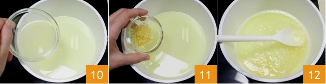 Geben Sie auch den Zitronensaft 10 und die abgeriebene Zitronenschale 11 hinzu. Rühren Sie die Zutaten um 12 und bringen Sie sie zum Kochen.