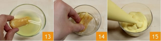 Lassen Sie den Sirup abkühlen und geben Sie ihn in eine kleine Schüssel. Jetzt können Sie beginnen, Ihr Tiramisu zusammenzustellen: Nehmen Sie die Löffelbiskuits, teilen Sie sie in der Mitte, bevor Sie sie schnell in den inzwischen kalten Sirup tauchen 13; dann legen Sie sie in die 190-ml-Gläser 14 (wenn Sie keine haben, können Sie eine rechteckige oder runde Form von etwa 1,9 l verwenden). Legen Sie zwei Hälften der getränkten Löffelbiskuits auf den Boden, bedecken Sie sie mit einer Schicht Creme und helfen Sie sich dabei mit dem Spritzbeutel 15.