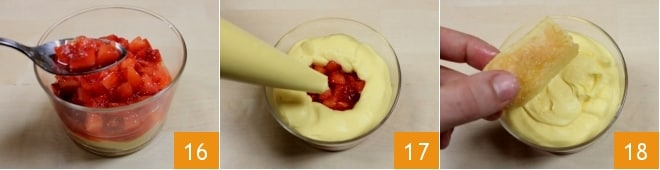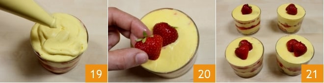 Decken Sie dann mit einer Schicht Erdbeeren ab 16 und lassen Sie sie gut an den Seiten der Gläser haften, um einen besseren visuellen Effekt zu erzielen. Decken Sie erneut mit Creme 17, dann beginnen Sie wieder mit einem halben Löffelbiskuit 18,