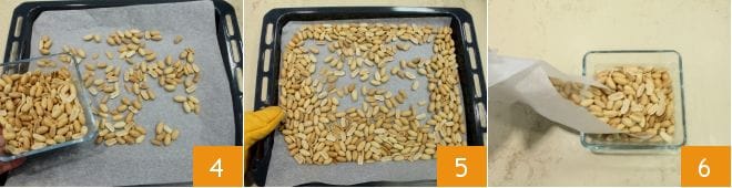 Wenn Sie fertig sind, erhalten Sie etwa 500 g geschälte Erdnüsse, die Sie auf einem mit Backpapier ausgelegten Backblech verteilen können 4. Verteilen Sie die Erdnüsse auf der gesamten Fläche, sodass sie sich so wenig wie möglich überlappen. Rösten Sie die Erdnüsse im vorgeheizten statischen Ofen bei 170° für 10-15 Minuten (bei Umluftofen bei 160° für 5-10 Minuten). Sobald sie fertig sind, nehmen Sie sie aus dem Ofen 5 und geben Sie sie in eine Schüssel, um sie vollständig abkühlen zu lassen. Sie können bei diesem Vorgang das verwendete Backpapier zur Hilfe nehmen 6.