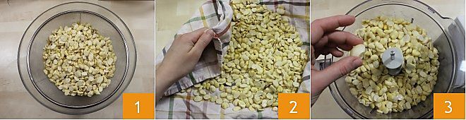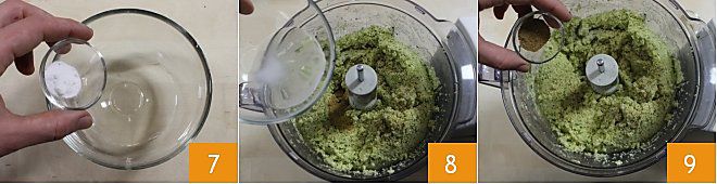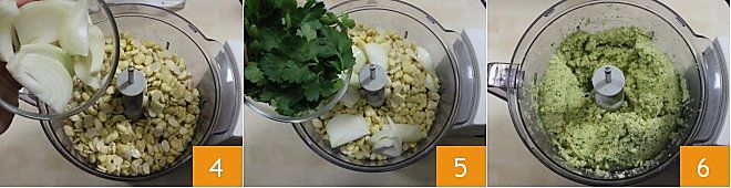 die grob geschnittene Zwiebel 4 und die Petersilie 5, mixen Sie die Favabohnen mit den Gewürzen, bis Sie eine homogene und kompakte Masse erhalten.