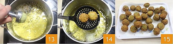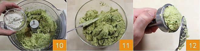 Zuletzt fügen Sie das Mehl hinzu 10 und mixen noch einen Moment weiter. Sie sollten eine nicht zu glatte, sondern körnige Masse erhalten 11. Erhitzen Sie das Öl und bringen Sie es auf die maximale Temperatur von 180° (wenn Sie es vorziehen, können Sie die Falafel auch in der Fritteuse frittieren). Das Backen im Ofen wird nicht empfohlen, da die Falafel ohne Panade Gefahr laufen, auszutrocknen. Nehmen Sie mit einem Teelöffel etwas von der Masse, ziehen Sie den Hebel des speziellen Falafel-Werkzeugs zurück (wenn Sie das Werkzeug nicht haben, können Sie leicht flache Bällchen formen, indem Sie Scheiben bilden); füllen Sie die Mulde, um eine kleine Kuppel zu formen 12, drücken Sie gut mit dem Löffel (jede Falafel wiegt etwa 30 g)