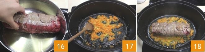 Braten Sie das Fleisch in einer Pfanne mit wenig Öl an 16, achten Sie darauf, es von allen Seiten gut anzubraten. In der Zwischenzeit eine Mischung aus Sellerie, Zwiebel und Karotte zubereiten und in einer beschichteten Pfanne mit zwei Esslöffeln Olivenöl extra vergine bei schwacher Hitze einige Minuten dünsten 17. Sobald das Falsomagro angebraten ist, in die Pfanne mit dem Sauté geben 18 und bei mittlerer Hitze weitergaren;