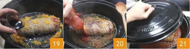 nach ein paar Minuten mit Rotwein ablöschen 19. Dann die Tomatenpassata 20 hinzufügen, einen Esslöffel dreifach konzentriertes Tomatenmark, Salz und Pfeffer. Mit einem Deckel abdecken 21 und das Falsomagro bei schwacher Hitze 60 Minuten lang kochen lassen, dabei gelegentlich wenden, um es gleichmäßig zu garen. Nach dieser Zeit prüfen, ob das Falsomagro fertig ist, indem man es mit einer Fleischgabel einsticht: Das Fleisch sollte zart sein.