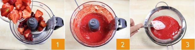 Um die Phyllo-Teig Cannoli mit Beeren-Baiser herzustellen, bereiten Sie zuerst das Baiser vor: Waschen und trocknen Sie die Himbeeren und Erdbeeren gut. Pürieren Sie die Beeren in einem Mixer (1-2) und passieren Sie die gewonnene Flüssigkeit durch ein Sieb, um die Samen zu filtern (die gefilterte Flüssigkeit sollte etwa 75 g wiegen) 3.