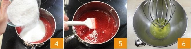 In einem kleinen Topf den Fruchtsaft und 100 g Zucker kombinieren 4, mit einem Löffel umrühren 5 und die Temperatur mit einem Küchenthermometer überprüfen. In der Zwischenzeit, wenn der Sirup 115° erreicht hat, die Eiweiße in einer Rührmaschine schlagen 6,