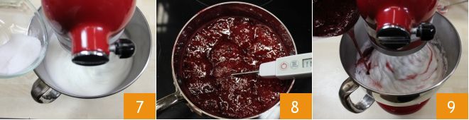 wenn sie halb steif sind, 25 g Zucker hinzufügen 7 und weiter schlagen, bis sie fest sind. Sobald der Sirup 121° erreicht hat 8, ihn vom Herd nehmen und in einem dünnen Strahl über die geschlagenen Eiweiße gießen 9