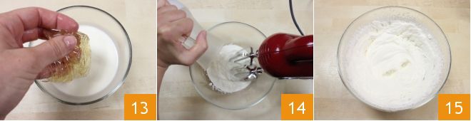 und lösen Sie sie in 50 ml lauwarmer Sahne auf 13. Die restlichen 250 ml Sahne schlagen (14-15) (für weitere Details zu diesem Vorgang konsultieren Sie die Anleitung Wie man Sahne schlägt in unserer Kochschule).