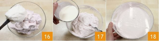 die geschlagene Sahne vorsichtig unter das Baiser heben 16, von unten nach oben rühren, um die Luftigkeit zu erhalten, schließlich die Sahne, in der Sie die Gelatine gelöst haben, hinzufügen 17 und gut vermischen, mit Frischhaltefolie abdecken 18 und für mindestens ein paar Stunden im Kühlschrank fest werden lassen.