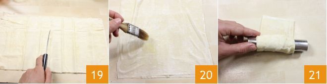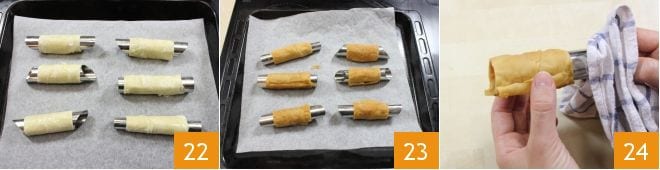 Bereiten Sie nun die Cannoli vor: Rollen Sie den Phyllo-Teig aus und teilen Sie ihn in der Mitte 19 und bestreichen Sie jedes Blatt mit geschmolzener Butter 20, legen Sie dann drei Blätter übereinander und teilen Sie sie in drei Teile in der Breite und dann in der Mitte in der Länge, um Rechtecke von etwa 7 x 10 cm zu erhalten. Rollen Sie jedes Rechteck auf einen Cannoli-Form 21 und achten Sie darauf, dass die ungebutterte Seite auf den Form kommt (sonst löst sich der Teig nach dem Backen nicht vom Form).
