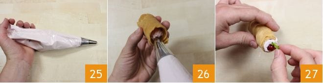 Die inzwischen festgewordene Creme in einen Spritzbeutel geben 25 und die Cannoli füllen 26. Mit einer Johannisbeere und einem Minzblatt garnieren 27, die Oberfläche mit Puderzucker bestäuben und servieren. Ihre Phyllo-Teig Cannoli mit Beeren-Baiser sind bereit, genossen zu werden!