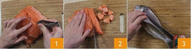 Zur Vorbereitung der Terrine aus Fisch und Spinat beginnen Sie mit der Reinigung des Fisches: Nehmen Sie den Lachs, entfernen Sie die Haut und die Gräten, falls vorhanden, mit Hilfe einer Pinzette 1, dann schneiden Sie ihn in Stücke 2 und legen ihn beiseite. Fahren Sie mit der Reinigung der Dorade fort: Entfernen Sie die Haut, filetieren Sie sie 3