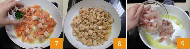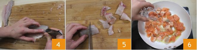 und entfernen Sie eventuelle Gräten mit einer Pinzette 4, dann schneiden Sie sie in Stücke 5. Gehen Sie auf die gleiche Weise vor, um den Barsch zu reinigen, und schneiden Sie auch diesen in Stücke. In einer antihaftbeschichteten Pfanne braten Sie den Lachs mit zwei Esslöffeln Öl und einer Knoblauchzehe bei mittlerer Hitze an, löschen Sie mit 30 g Weißwein ab 6, dann schmecken Sie mit Salz und Pfeffer ab