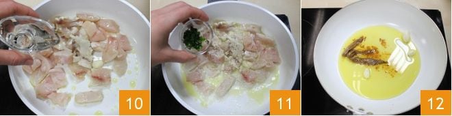löschen Sie mit dem restlichen Weißwein ab 10, fügen Sie eine großzügige Menge gehackter Petersilie hinzu 11 und schmecken Sie mit Salz und Pfeffer ab. Lassen Sie alles für ein paar Minuten bei mittlerer Hitze kochen und legen Sie den gekochten Fisch dann beiseite.