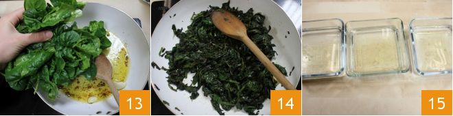 Reinigen und waschen Sie den Spinat gründlich unter fließendem Wasser, lassen Sie ihn abtropfen und braten Sie ihn für ein paar Minuten bei mittlerer Hitze in einer antihaftbeschichteten Pfanne mit zwei Esslöffeln Öl, drei Knoblauchzehen und den Sardellenfilets an 13. Wenn er gekocht ist, schalten Sie die Hitze aus und legen Sie ihn ebenfalls beiseite 14, aber warm. In drei verschiedenen Schüsseln mit kaltem Wasser legen Sie die Gelatineblätter ein: 5g für den Lachs, 5g für die Dorade und den Barsch und 7g für den Spinat 15.