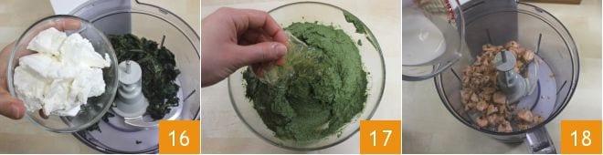 Mixen Sie den Spinat zusammen mit der Ricotta 16 und passen Sie, falls nötig, Salz und Pfeffer an. Fügen Sie die gut ausgedrückten Gelatineblätter zur noch warmen Spinatmischung hinzu und lassen Sie sie gründlich schmelzen 17. Mixen Sie nun den Lachs mit 100 ml Sahne 18,