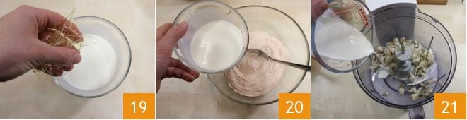 schmelzen Sie die Gelatineblätter in 50 ml lauwarmer Sahne und mischen Sie sie in die Mischung ein (19-20). Mixen Sie dann den Barsch und die Dorade mit 100 ml Sahne 21
