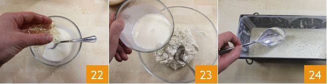 und fügen Sie auch hier die letzten 5g Gelatineblätter hinzu, die in 50 ml lauwarmer Sahne geschmolzen sind (22-23). Nehmen Sie eine Kastenform mit den Maßen 27x10 cm, legen Sie sie mit Backpapier aus und gießen Sie die Mischung aus Dorade und Barsch hinein, dann stellen Sie sie für 15/20 Minuten in den Gefrierschrank, bevor Sie mit der zweiten Schicht fortfahren 24.